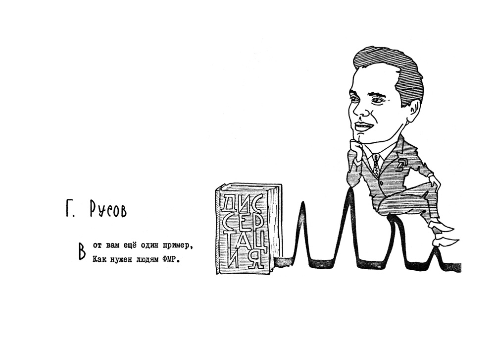 Дружеский шарж Русова Г.И. из книги шаржей и эпиграмм"Музей друзей", первая часть которой вышла в 1967 году. Авторами ее являются научные сотрудники института О.А. Баюков и Н.С. Чистяков. Книга вышла малым тиражом (всего 100 экземпляров) и моментально разошлась среди персонажей книги, сотрудников и была подарком авторов к юбилею института.
