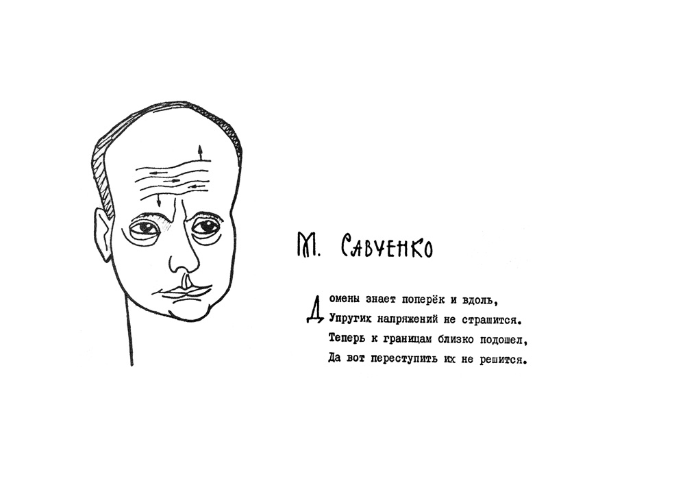 Дружеский шарж Савченко М.К. из книги шаржей и эпиграмм"Музей друзей", первая часть которой вышла в 1967 году. Авторами ее являются научные сотрудники института О.А. Баюков и Н.С. Чистяков. Книга вышла малым тиражом (всего 100 экземпляров) и моментально разошлась среди персонажей книги, сотрудников и была подарком авторов к юбилею института.