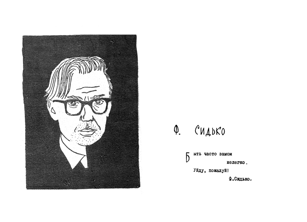 Дружеский шарж Сидько Ф.Я. из книги шаржей и эпиграмм"Музей друзей", первая часть которой вышла в 1967 году. Авторами ее являются научные сотрудники института Баюков О.А.и Чистяков Н.С. Книга вышла малым тиражом (всего 100 экземпляров) и моментально разошлась среди персонажей книги, сотрудников и была подарком авторов к юбилею Института физики Сибирского отделения Академии наук СССР. Красноярск.