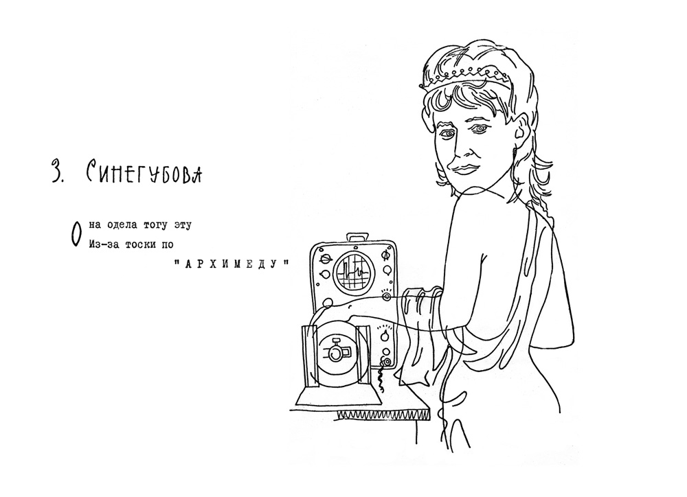 Дружеский шарж Синегубовой З.И. из книги шаржей и эпиграмм"Музей друзей", первая часть которой вышла в 1967 году. Авторами ее являются научные сотрудники института О.А. Баюков и Н.С. Чистяков. Книга вышла малым тиражом (всего 100 экземпляров) и моментально разошлась среди персонажей книги, сотрудников и была подарком авторов к юбилею института.