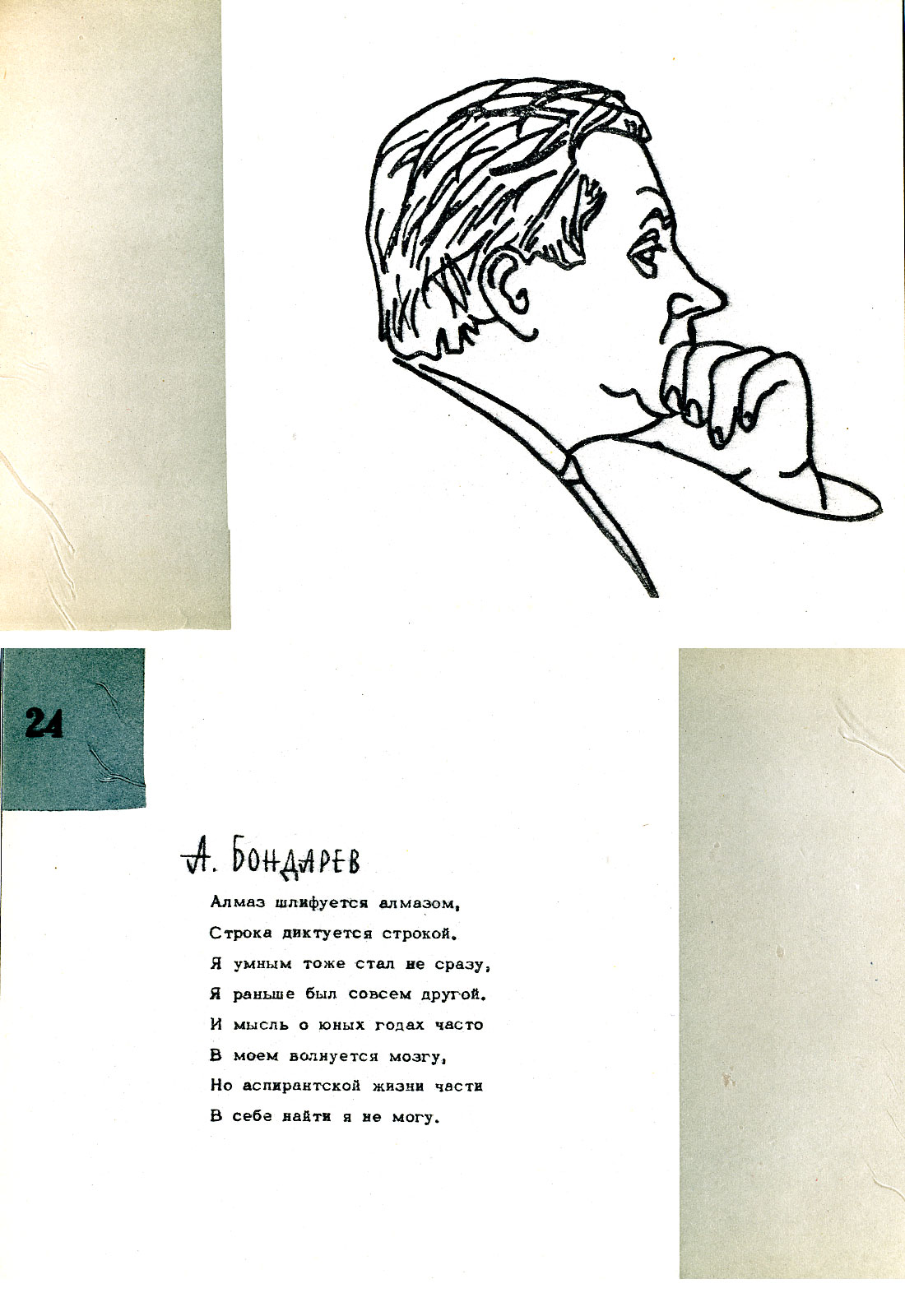Дружеский шарж Бондарева А.Ф. из книги "Музей друзей", изданной научными сотрудниками Института физики Сибирского отделения АН СССР Олегом Артемьевичем Баюковым и Николаем Сергеевичем Чистяковым. Удивительная книжка дружеских шаржей и эпиграмм на сотрудников. Она вышла в 1967 году к 10-летию начала работы института. Вышла небольшим тиражом в 100 экземпляров и распространялась строго по списку, лично в руки. Узнать себя на страницах книги смогли 48 самых ярких и заметных личностей молодого института. Позже (в 1971 году) вышла вторая книга под таким же названием. Что побудило их взяться за такой труд, авторы подробно изложили в предисловии к первой и второй книгам. Книги размещены на сайте. Красноярск.
