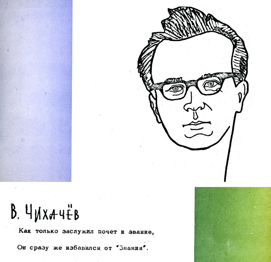 Дружеский шарж Чихачева В.А. из книги "Музей друзей", изданной научными сотрудниками Института физики Сибирского отделения Академии наук СССР (ИФ СО АН СССР) Олегом Артемьевичем Баюковым и Николаем Сергеевичем Чистяковым. Удивительная книжка дружеских шаржей и эпиграмм на сотрудников Института физики СО АН СССР. Она вышла в 1967 году к 10-летию начала работы института. Вышла небольшим тиражом в 100 экземпляров и распространялась строго по списку, лично в руки. Узнать себя на страницах книги смогли 48 самых ярких и заметных личностей молодого института. Позже (в 1971 году) вышла вторая книга под таким же названием. Что побудило их взяться за такой труд, авторы подробно изложили в предисловии к первой и второй книгам. Книги размещены на сайте.