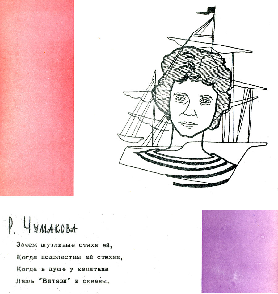 Дружеский шарж Чумаковой Р.И. из книги "Музей друзей", изданной научными сотрудниками Института физики Сибирского отделения Академии наук СССР (ИФ СО АН СССР) Олегом Артемьевичем Баюковым и Николаем Сергеевичем Чистяковым. Удивительная книжка дружеских шаржей и эпиграмм на сотрудников Института физики СО АН СССР. Она вышла в 1967 году к 10-летию начала работы института. Вышла небольшим тиражом в 100 экземпляров и распространялась строго по списку, лично в руки. Узнать себя на страницах книги смогли 48 самых ярких и заметных личностей молодого института. Позже (в 1971 году) вышла вторая книга под таким же названием. Что побудило их взяться за такой труд, авторы подробно изложили в предисловии к первой и второй книгам. Книги размещены на сайте.