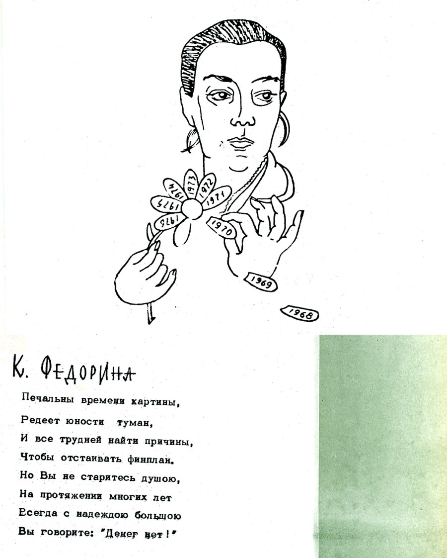 Дружеский шарж Федориной К.А. из книги "Музей друзей", изданной научными сотрудниками Института физики Сибирского отделения Академии наук СССР (ИФ СО АН СССР) Олегом Артемьевичем Баюковым и Николаем Сергеевичем Чистяковым. Удивительная книжка дружеских шаржей и эпиграмм на сотрудников Института физики СО АН СССР. Она вышла в 1967 году к 10-летию начала работы института. Вышла небольшим тиражом в 100 экземпляров и распространялась строго по списку, лично в руки. Узнать себя на страницах книги смогли 48 самых ярких и заметных личностей молодого института. Позже (в 1971 году) вышла вторая книга под таким же названием. Что побудило их взяться за такой труд, авторы подробно изложили в предисловии к первой и второй книгам. Книги размещены на сайте.
