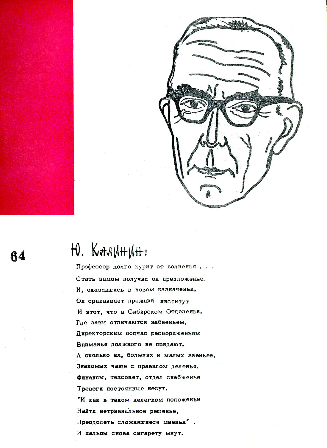 Калинин Ю.Д. Дружеский шарж из книги "Музей друзей" созданной научными сотрудниками Института физики Сибирского отделения АН СССР Олегом Артемьевичем Баюковым и Николаем Сергеевичем Чистяковым. Эта удивительная книжка дружеских шаржей и эпиграмм на сотрудников института издана в 1967 году к 10-летию начала работы института. Красноярск.