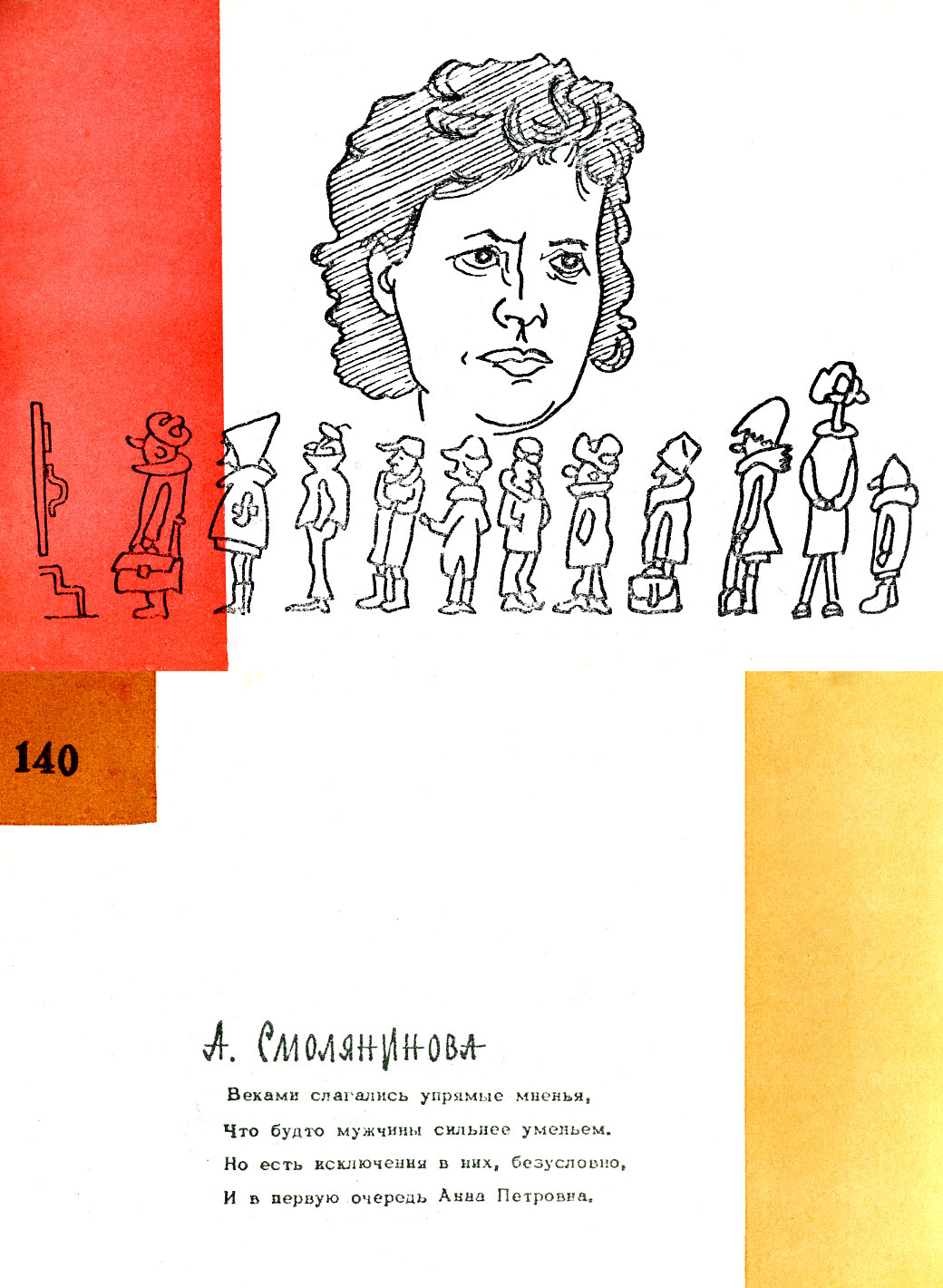 Дружеский шарж Смоляниновой А.П. из книги "Музей друзей", изданной научными сотрудниками Института физики Сибирского отделения Академии наук СССР (ИФ СО АН СССР) Олегом Артемьевичем Баюковым и Николаем Сергеевичем Чистяковым. Удивительная книжка дружеских шаржей и эпиграмм на сотрудников Института физики СО АН СССР. Она вышла в 1967 году к 10-летию начала работы института. Вышла небольшим тиражом в 100 экземпляров и распространялась строго по списку, лично в руки. Узнать себя на страницах книги смогли 48 самых ярких и заметных личностей молодого института. Позже (в 1971 году) вышла вторая книга под таким же названием. Что побудило их взяться за такой труд, авторы подробно изложили в предисловии к первой и второй книгам. Книги размещены на сайте.