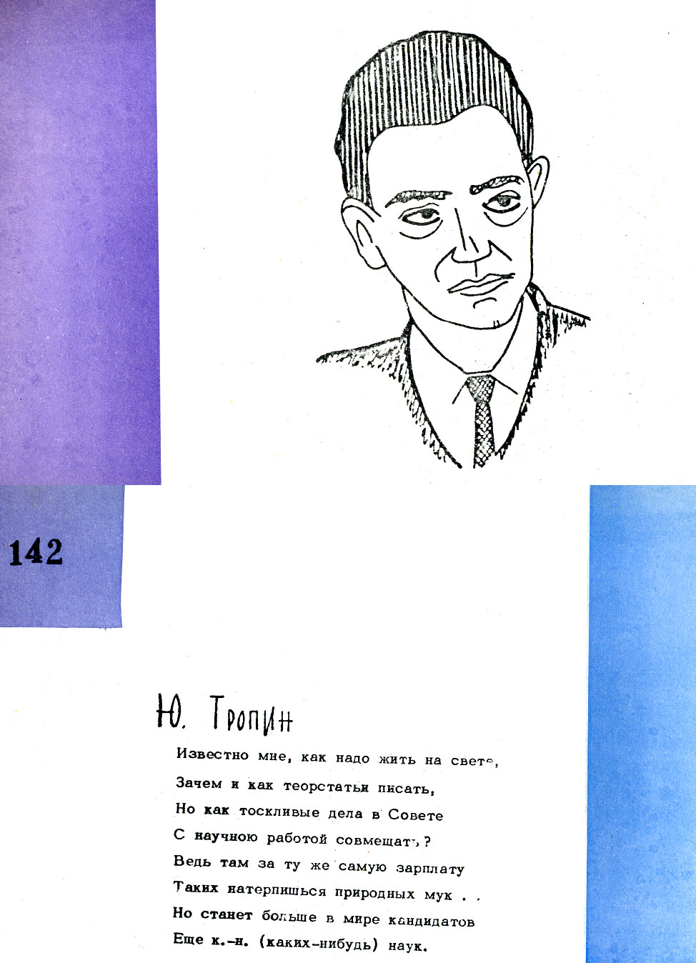 Дружеский шарж Тропина Ю. Д. из книги "Музей друзей", изданной научными сотрудниками Института физики Сибирского отделения Академии наук СССР Олегом Артемьевичем Баюковым и Николаем Сергеевичем Чистяковым. Удивительная книжка дружеских шаржей и эпиграмм на сотрудников. Она вышла в 1967 году к 10-летию начала работы института. Вышла небольшим тиражом в 100 экземпляров и распространялась строго по списку, лично в руки. Узнать себя на страницах книги смогли 48 самых ярких и заметных личностей молодого института. Позже (в 1971 году) вышла вторая книга под таким же названием. Что побудило их взяться за такой труд, авторы подробно изложили в предисловии к первой и второй книгам. Книги размещены на сайте. Красноярск.